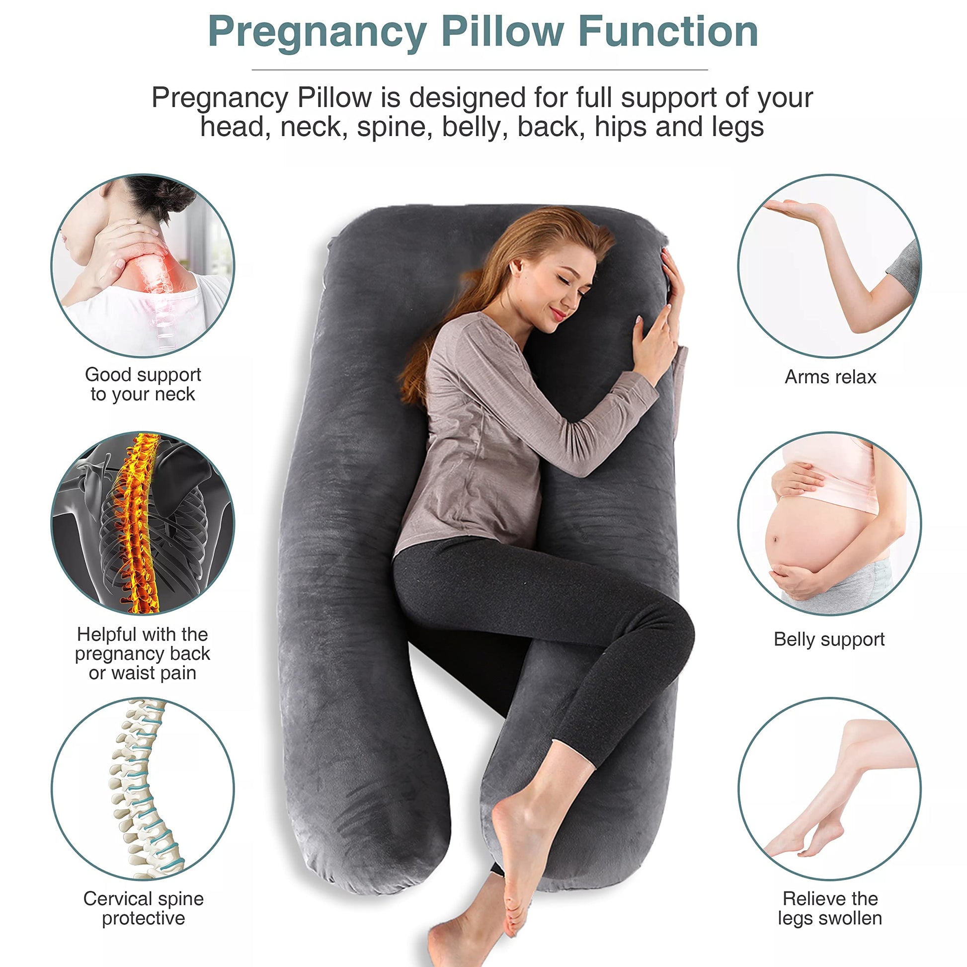 Mbështetje ergonomike për shpinë, bark dhe këmbë. Lehtëson dhimbjet, siguron gjumë të rehatshëm dhe përdoret edhe pas lindjes për ushqyerje me gji ose relaks.