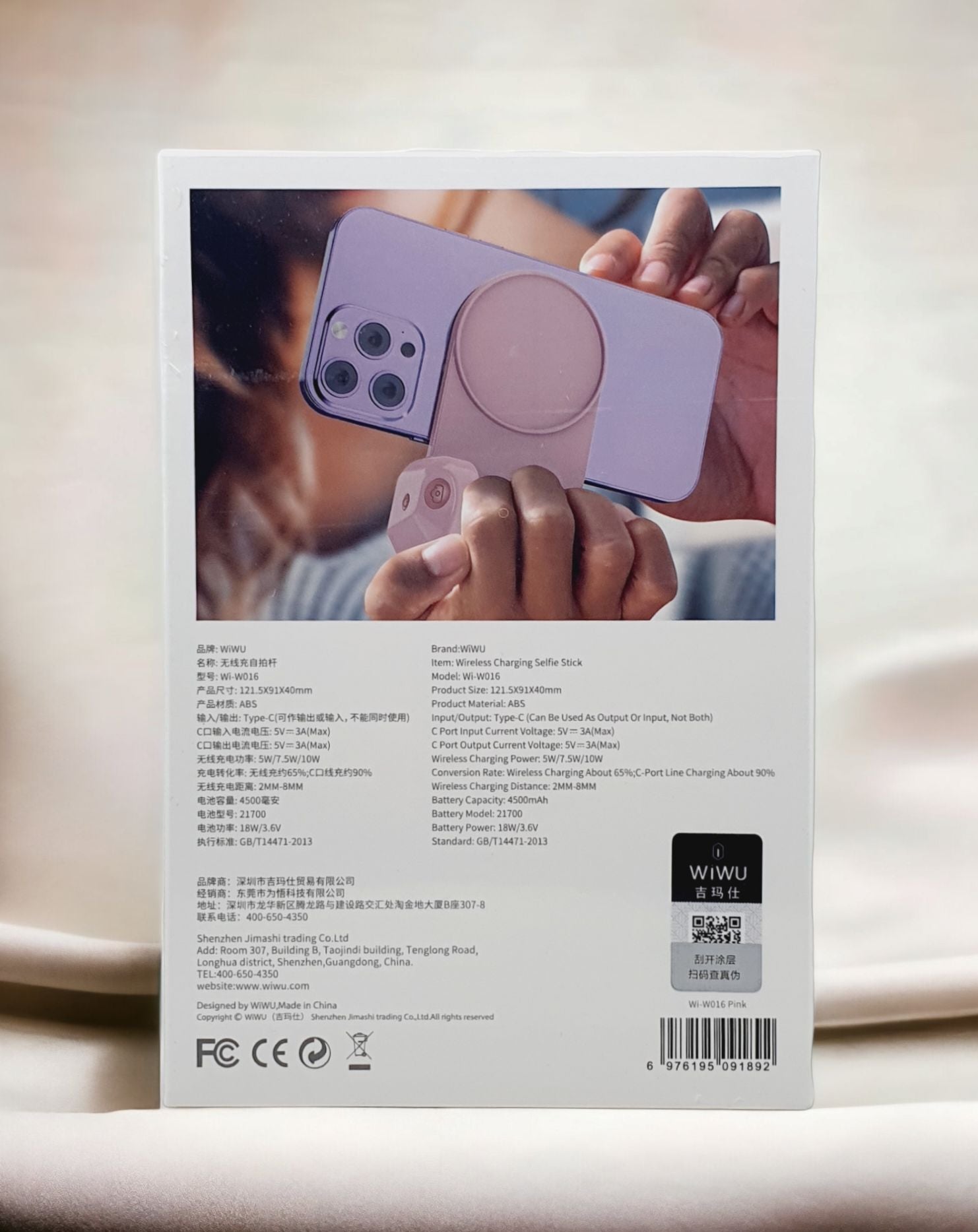 Falë karikuesit wireless magnetik të integruar, pajisja mund të karikohet edhe përmes kabllos C-C. Përveç karikimit, WIWU WI-W016 funksionon edhe si mbajtëse telefoni dhe selfie stick, duke ju mundësuar të bëni foto dhe të regjistroni video pasi ta lidhni telefonin me Bluetooth.
