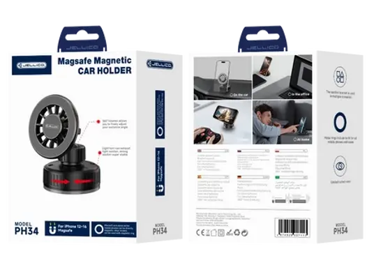 Jellico MagSafe Car Holder është një mbajtës magnetik për telefon në makinë që përdor teknologjinë MagSafe për të stabilizuar telefonin në vend gjatë drejtimit dhe për të ofruar karikim pa tel derisa telefoni është në vend. Ai është projektuar për përdorim në ventilimin e makinës dhe mund të rrotullohet 360° për të gjetur këndin më të mirë të shikimit, si për navigacion ashtu edhe për përdorime të tjera.