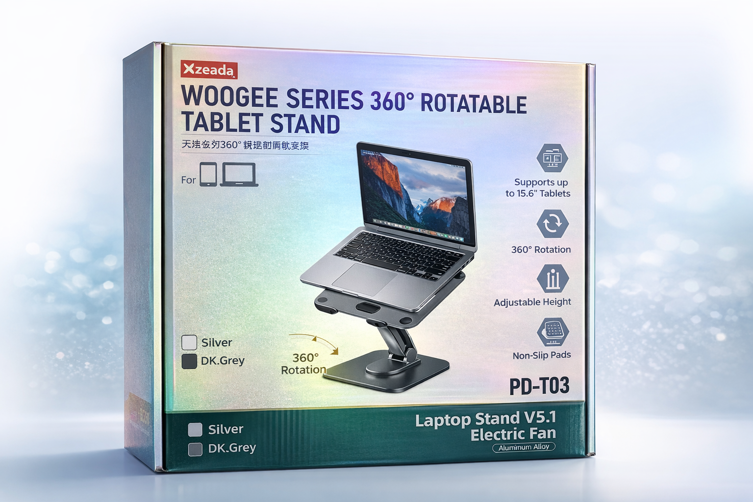 Mbajtësja e tabletit ose tabletit Azeada Woogee Series 360° Rotatable Tablet Stand është një mbajtëse premium e projektuar për të ofruar rehati maksimale dhe fleksibilitet gjatë përdorimit të tabletit apo laptopit tuaj. Falë ndërtimit prej alumini cilësor dhe dizajnit modern, kjo mbajtëse është ideale për punë, mësim, video call, shikim filmash apo përdorim të përditshëm në shtëpi dhe zyrë.